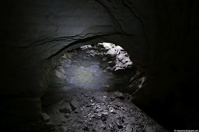 W tej części nie ma naturalnych jaskiń, co nie znaczy, że woda nie wwiercała się w te ściany. Na zdjęciu powyżej można zobaczyć prawdopodobnie lej krasowy. Można sądzić, że kiedyś wydrążyła go woda, potem zasypały różne osady, a dzięki pracy dawnych kamieniołomów został ponownie odsłonięty.