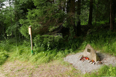 Osada nie ma dziś stałych obywateli. Kto śledzi ten wspomnieniowy cykl wie oczywiście, dlaczego: najpierw wysiedlenia Niemców (dla których osada nazywała się Buchwaldem), potem Żelazna Kurtyna, potem park narodowy. Ale jednak trochę zabudowań jest. Po pierwsze, jest kapliczka pw. św. Michała (pokazywana już dawniej na fejsbuku). Odbudowano ją w miejscu dawniejszej w 1992 roku, gdy żyjący jeszcze wtedy dawni mieszkańcy mogli tu z powrotem przyjeżdżać. Niemiecki napis na elewacji to po prostu "Niech będzie pochwalony Jezus Chrystus".