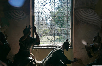 Wnętrza kaplic - w wielu przypadkach zaskakująco obszerne - wypełniają teatralne sceny zestawione z dziesiątków postaci w normalnych wymiarach. Niestety, na co dzień możemy podglądać te sceny tylko przez okna. W połączeniu z bardzo silnym kontrastem - lombardzkie słońce na zewnątrz, ciemności wewnątrz - to bardzo utrudnia docenienie całej sceny, rzeźby, i barw. Tym bardziej na nieudolnych zdjęciach. Ale co nieco mogę pokazać. Mamy więc między innymi Nawiedzenie (druga kaplica)...